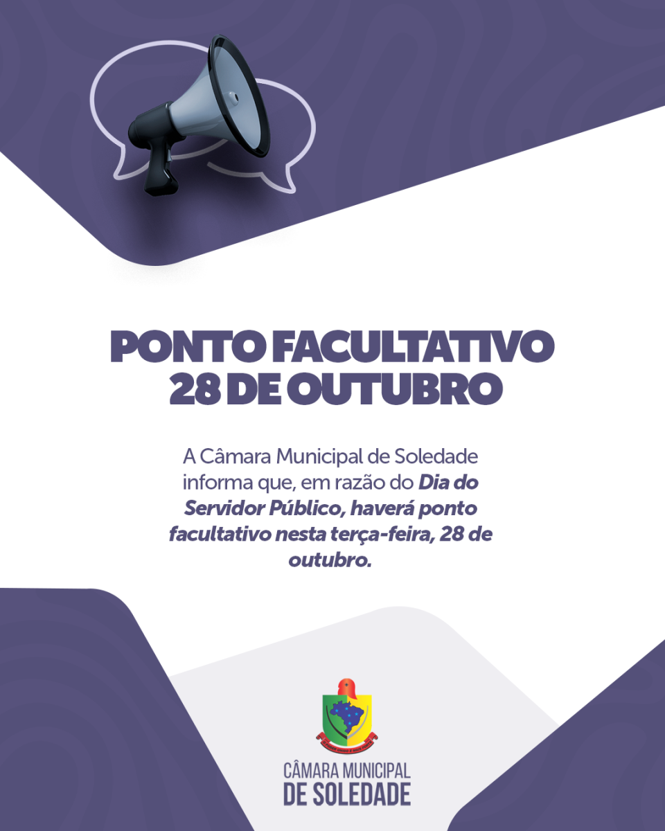 A Câmara Municipal de Soledade informa que, em razão do Dia do Servidor Público, haverá ponto facultativo na terça-feira, 28 de outubro.